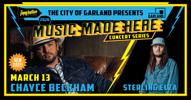 Country music takes center stage in Downtown Garland now on Friday, March 13, as Chayce Beckham and Sterling Elza bring a night of grit, heart, and high-energy performances to our Music Made Here Concert Series!